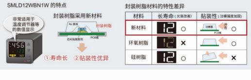 近年来,为了提高设计灵活性和视认性,作为工业设备和消费电子设备中显示面板的数字显示和指示灯光源,使用小型白光LED的应用案例持续增加。尤其是在工业设备市场,对于可靠性高、使用10年以上也不会发生通电导致的光衰问题的LED需求高涨。而另一方面,白光贴片LED的注模部分以往多采用环氧树脂或硅树脂,在对可靠性要求很高的应用中,存在光衰和贴装时的注模强度方面的课题。
