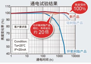 此次开发的LED,通过采用新树脂,在通电试验时(25℃,IF=20mA,1,000小时通电)中,成功保持了100%的亮度。例如,在相同的光通量条件下进行比较时,寿命延长达20倍左右。