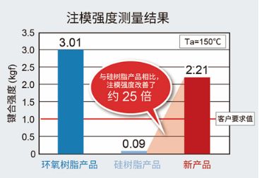 通过采用新树脂,在直接影响贴装性的注模强度方面,与硅树脂产品相比,在高温条件(Ta=150℃)下注模强度改善了约25倍。这使得贴装时不容易发生不良问题,从而可实现优异的贴装性。