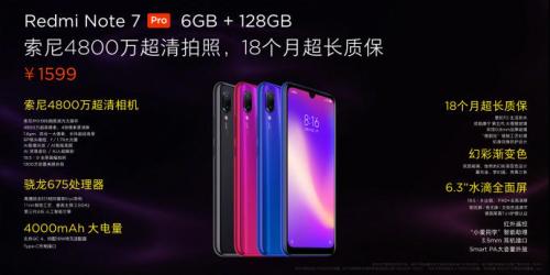硬件配置方面,Redmi Note7 Pro搭载高通骁龙675处理器,后置摄像头为4800万像素的索尼IMX586+500万像素的镜头组合,前置摄像头为1300万像素,辅以6GB+128GB的存储容量,最大支持256GB的SD卡存储扩展,内置4000毫安时大电池,Type-C接口与3.5mm耳机孔并存,保留红外遥控功能,支持18W快充,预装基于Android9.0深度定制的MIUI10,售价1599元,于3月19日10点开卖。