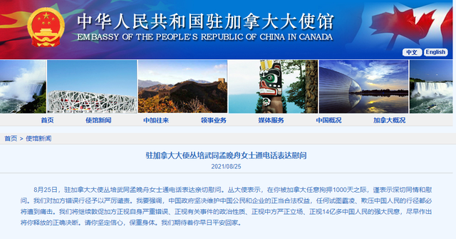 据中国驻加拿大大使馆网站消息,8月25日,驻加拿大大使丛培武同孟晚舟女士通电话表达亲切慰问。 丛大使表示,在你被加拿大任意拘押1000天之际,谨表示深切同情和慰问。我们对加方错误行径予以严厉谴责。我要强调,中国政府坚决维护中国公民和企业的正当合法权益,任何试图霸凌、欺压中国人民的行径都必将遭到痛击。我们将继续敦促加方正视自身严重错误、正视有关事件的政治性质、正视中方严正立场、正视14亿多中国人民的强大民意,尽早作出将你释放的正确决断。请你坚