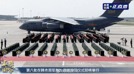 【山河已无恙,英魂请安息!109名在韩志愿军烈士明日安葬】今天,109位志愿军烈士英灵及1226件相关遗物回到祖国怀抱。专机进入中国领空后,空军两架战斗机护航;沈阳桃仙机场以“过水门”最高礼遇迎接。烈士遗骸棺椁覆盖国旗,现场全体人员向烈士遗骸三鞠躬。明日,第八批在韩志愿军烈士安葬仪式将于沈阳抗美援朝烈士陵园举行。忠魂不泯,浩气长存!英雄回家(总台记者田忠卿 裴奔 徐静)