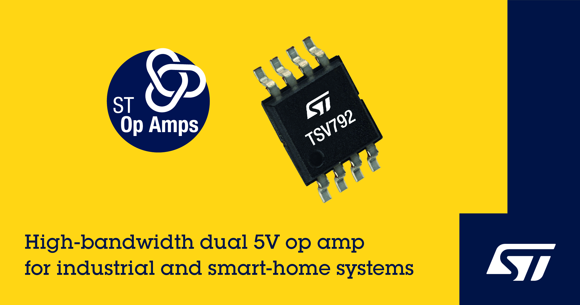 意法半导体的 TSV792 5V双运算放大器(op amp)具有50MHz的增益带宽积和低输入失调电压、10pA输入偏置电流等高精度特性。
