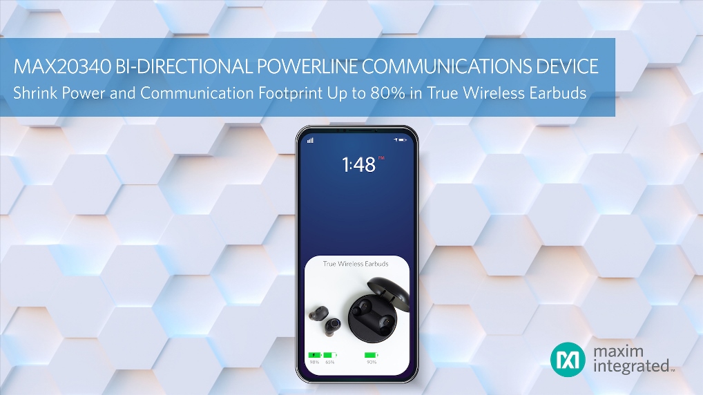 近日,Maxim Integrated Products, Inc宣布推出业界最小的2引脚双向直流电力线通信(PLC)器件MAX20340,在超低功耗便携式和可穿戴应用中将充电底座的供电和通信接口尺寸减小80%。通过单根线路供电并进行数据通信,MAX20340省去了充电底座与真无线耳机、手环及其他小型可穿戴低压设备间通信所需的引脚和分立器件。与最接近的竞争方案相比,该产品有效简化设计,且为每只耳机节省13mm2的占位面积。