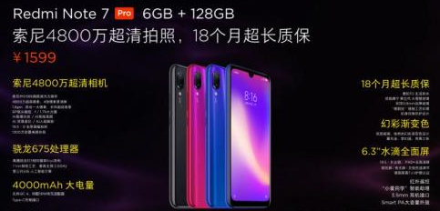 今天下午Redmi新品发布会来袭,在这场发布会上一共有以下四款产品登场: 首先是Redmi Note7 Pro,它正面采用6.3英寸的水滴屏设计(TFT屏幕),分辨率为2340X1080,机身尺寸为159.21×75.21×8.1(mm),重达186克,机身有包含暮光金、幻彩蓝、亮金黑在内的多种颜色供选择。
